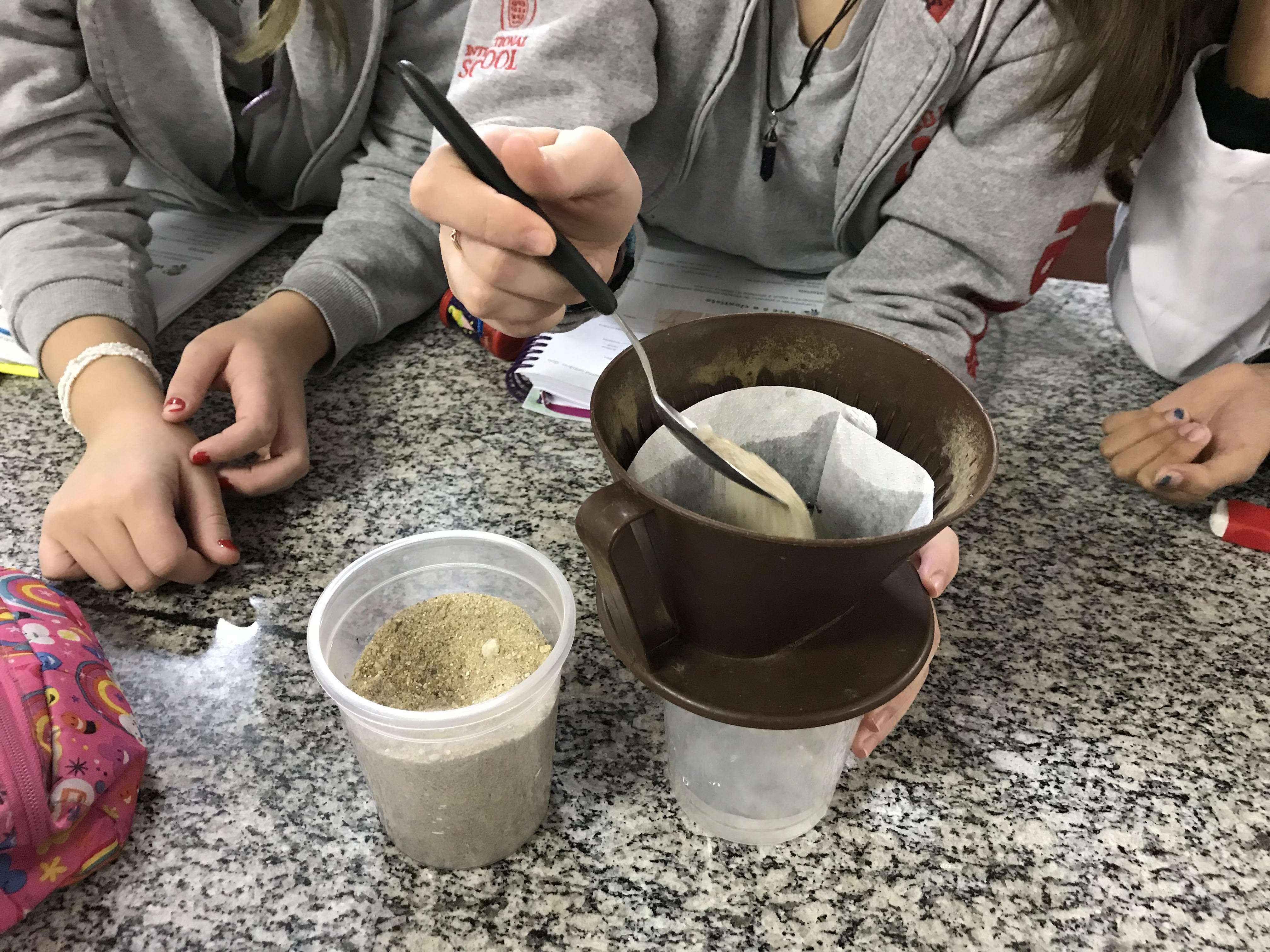Dissolvemos a areia em água, imitando o processo do sangue. Em seguida, definimos que cada filtro de papel seria um rim e sua função seria permitir que somente a água passasse através dele. Assim como o rim, o coador de papel equilibra a quantidade adequada de água e areia, fazendo com que o excesso no coador fique preso para ser eliminado.