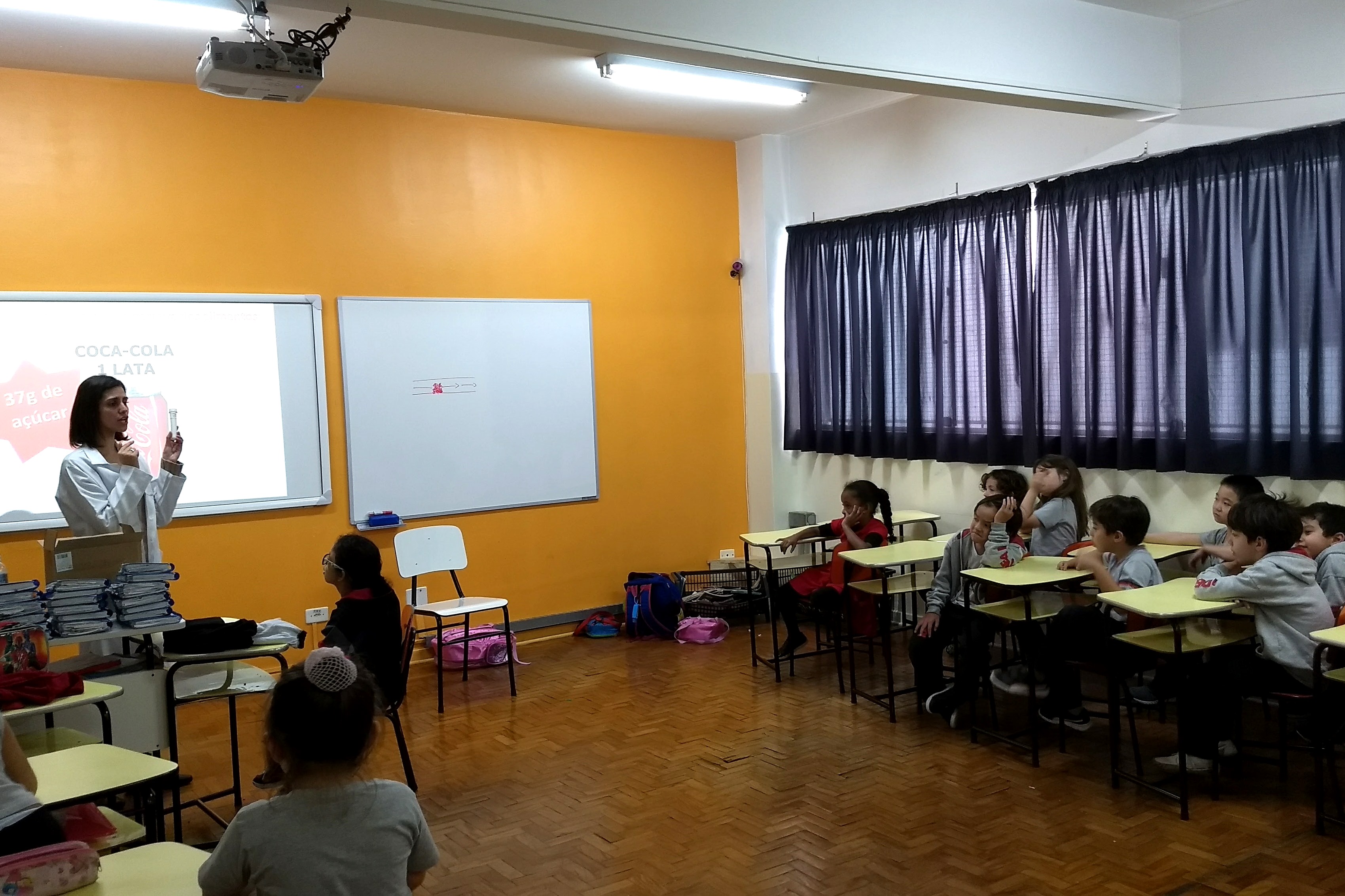 A nutricionista do Colégio abordou com as crianças da Escola Clube a quantidade de açúcar e gordura presentes em alguns alimentos ultraprocessados, como por exemplo, refrigerante, achocolatado, suco em pó e de caixinha, bolacha recheada, salgadinho, hambúrguer, salsicha e fast food.