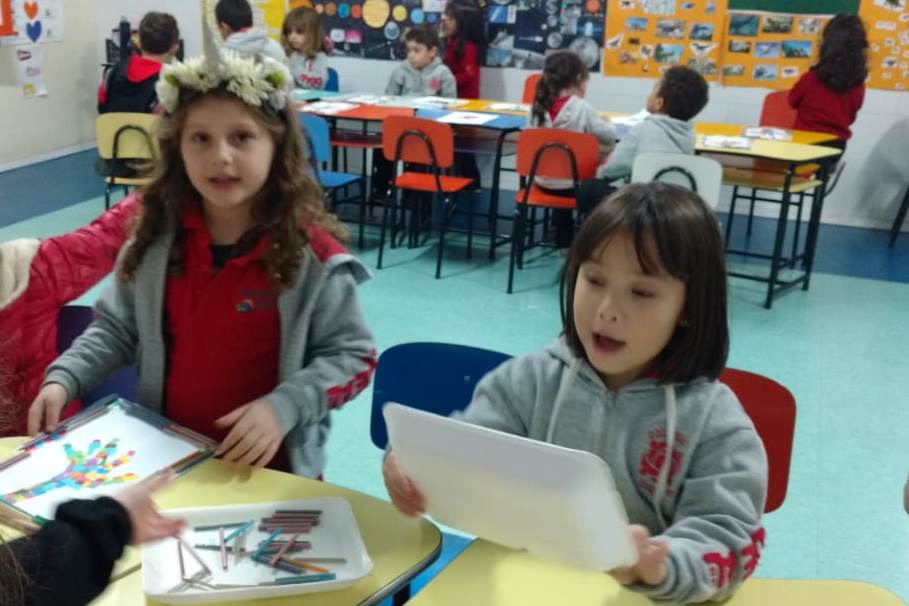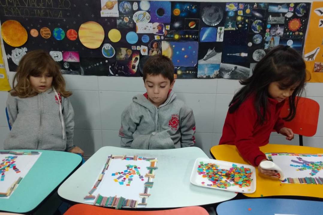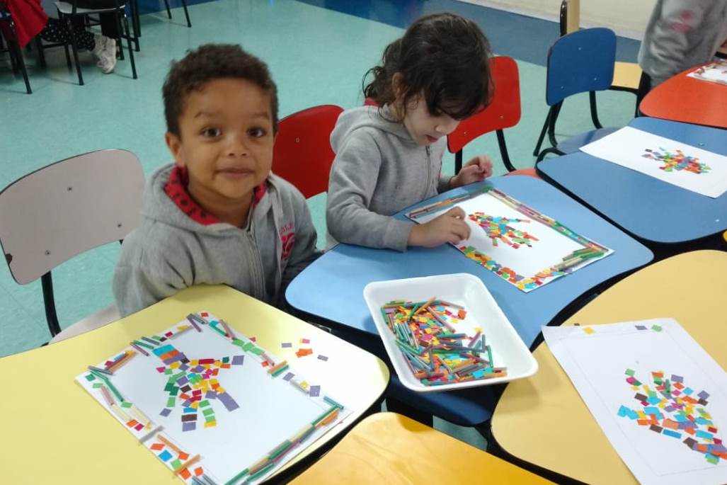 Nesta atividade, as crianças do infantil III e IV efetuaram uma colagem com papéis coloridos, desenhando as próprias mãos e emoldurando-as com canudinhos coloridos.