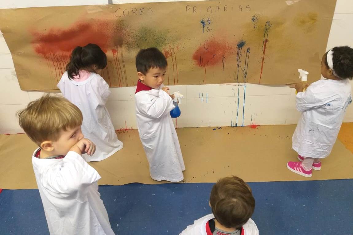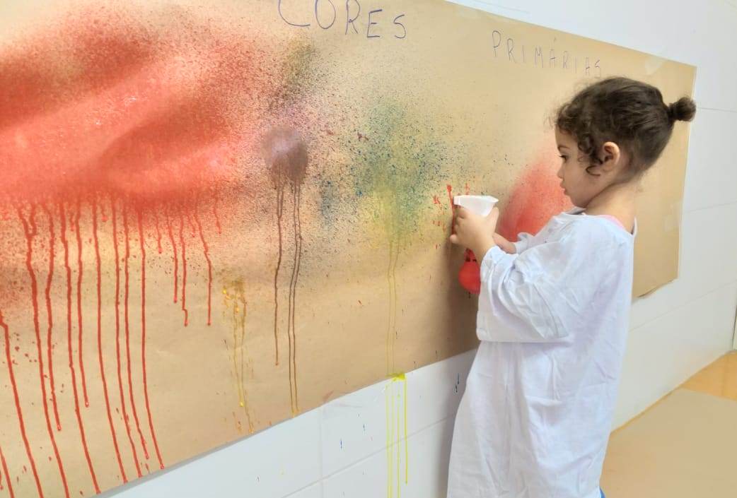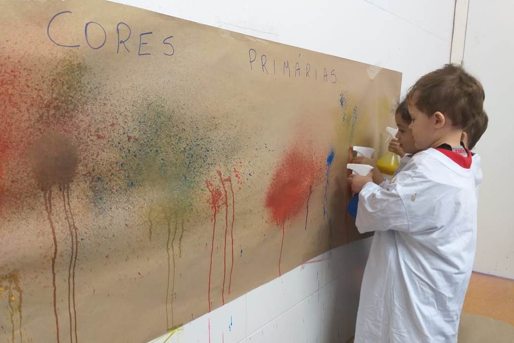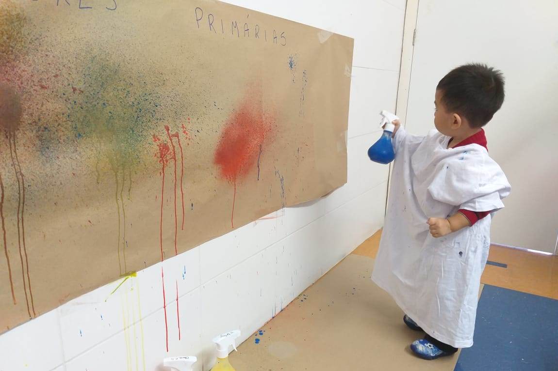 Os alunos do Infantil I participaram de uma atividade de pintura com borrifador com tinta dentro. A atividade desenvolve a coordenação motora, preensão, força, criação e aprendizagem das cores