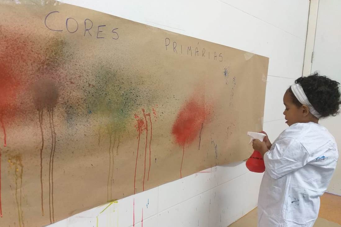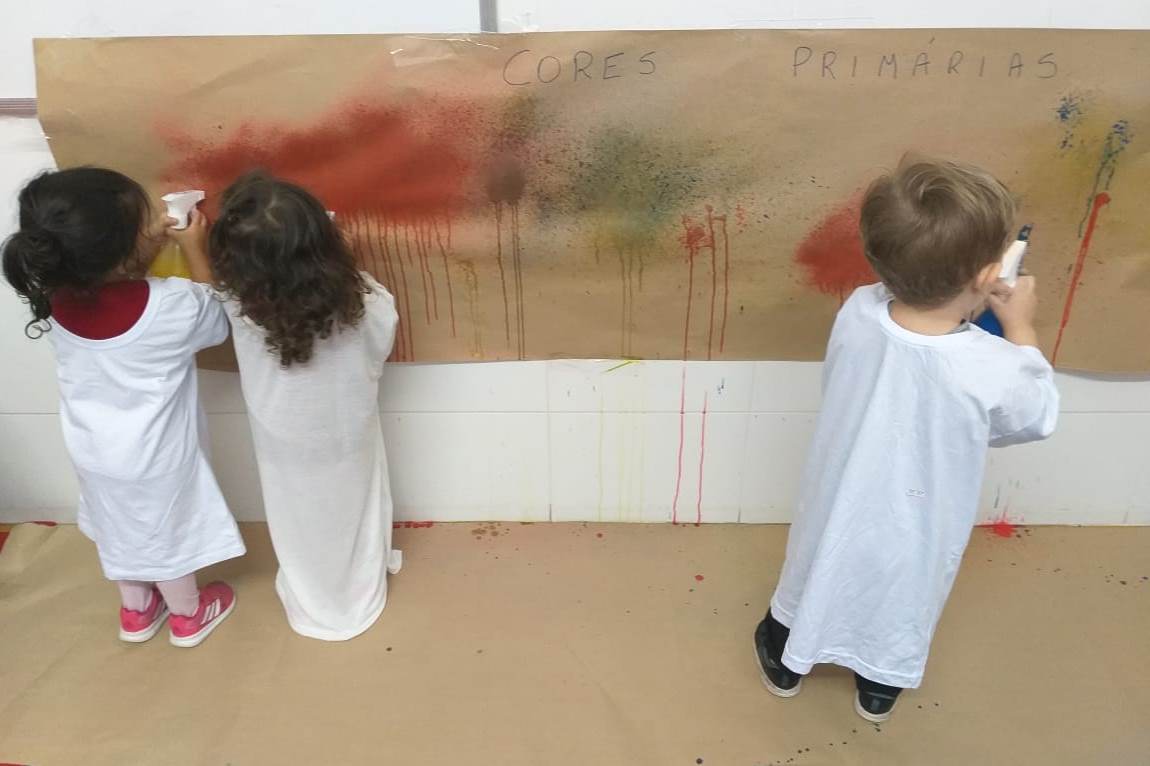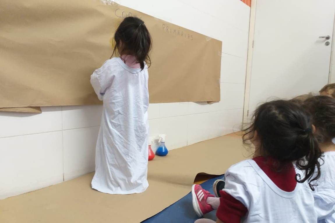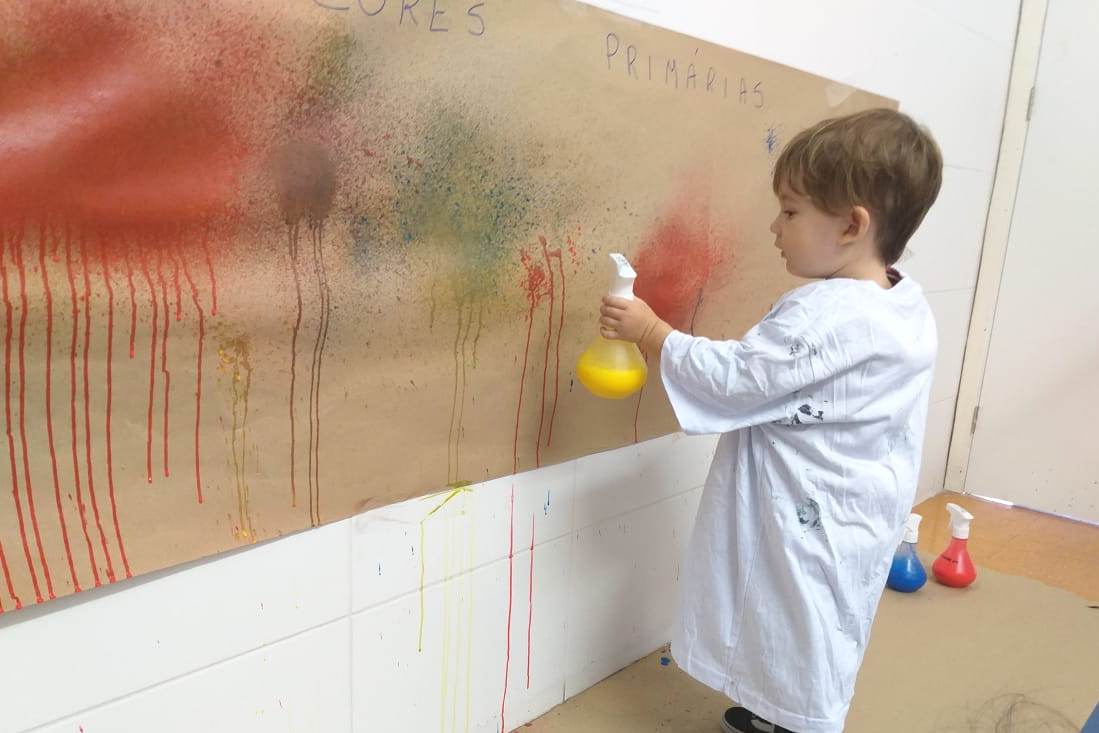 Os alunos do Infantil I participaram de uma atividade de pintura com borrifador com tinta dentro. A atividade desenvolve a coordenação motora, preensão, força, criação e aprendizagem das cores